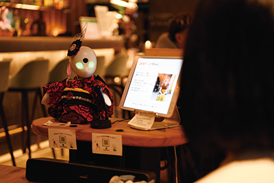 ▲ 「OriHime」を操作する三好氏と話している様子。このように、カフェ利用者は「OriHime」を通じてパイロットとの会話を楽しめる。インバウンド客も多く、パイロットとカフェ利用者が英語で和やかに会話している様子も見受けられた
