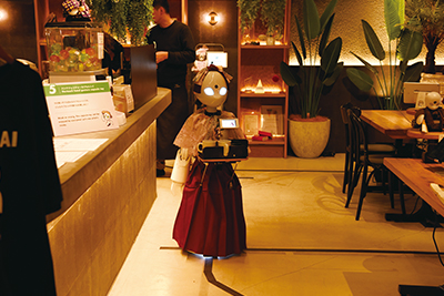 ▲ 配膳をしている「OriHime-D」。「OriHime」のデザインは能面がモチーフなのだそう。パイロットの個性や表情を想像できるよう、あえてシンプルなデザインにしている